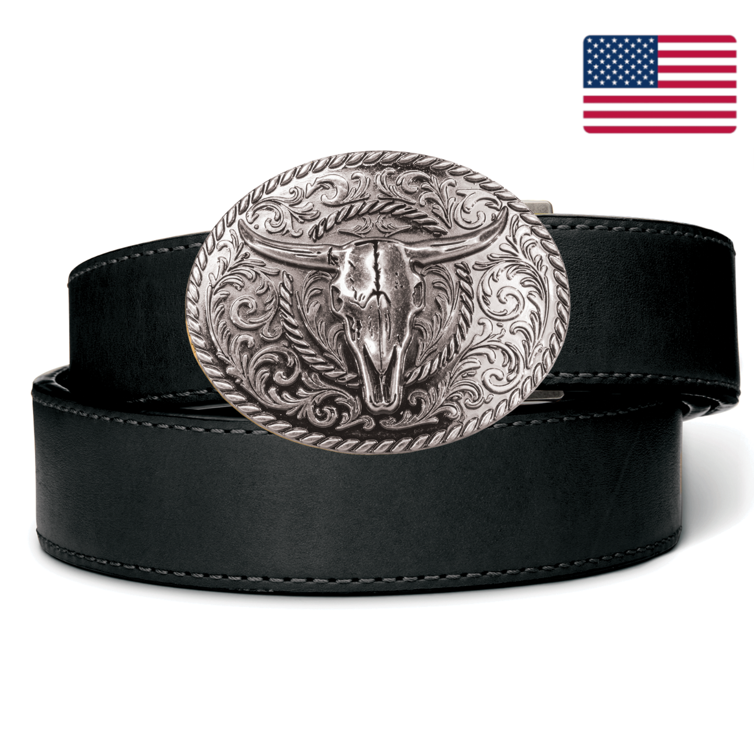 Includes: Bull Skull Antique Silver Buckle, Black Reinforced Leather Ranch Gun Belt [1.5”] , Hex Wrench & Set Screws