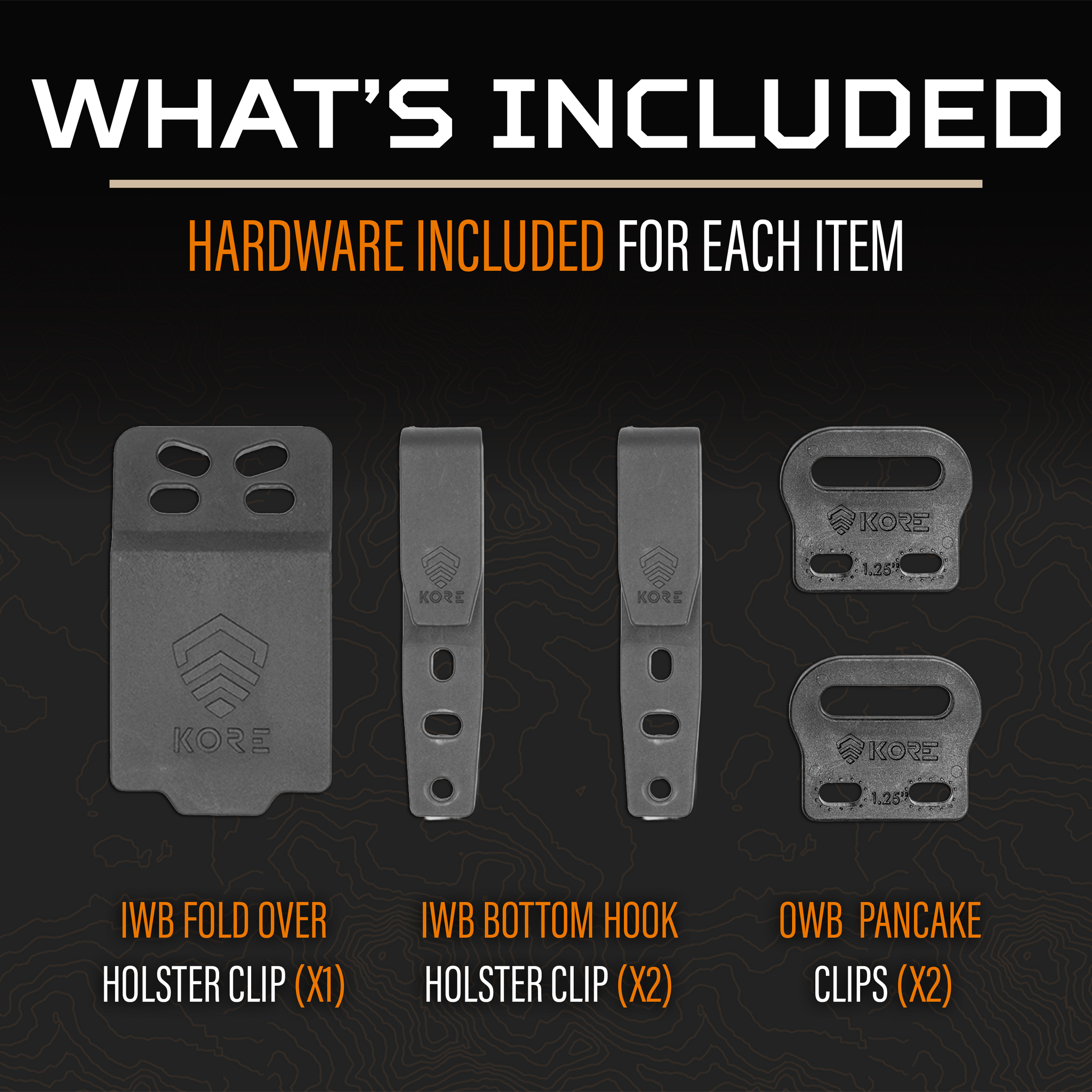 Includes: 2x Bottom Hook Holster Clips (IWB), 1x Fold Over Holster Clip (IWB), 2x Pancake Loops (OWB)