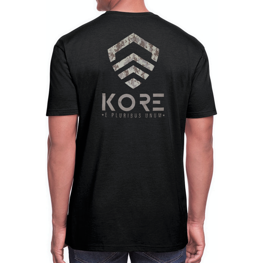Features Kore Desert Camo shield on the back with 'E Pluribus Unum' and smaller Kore logo with shield on front.