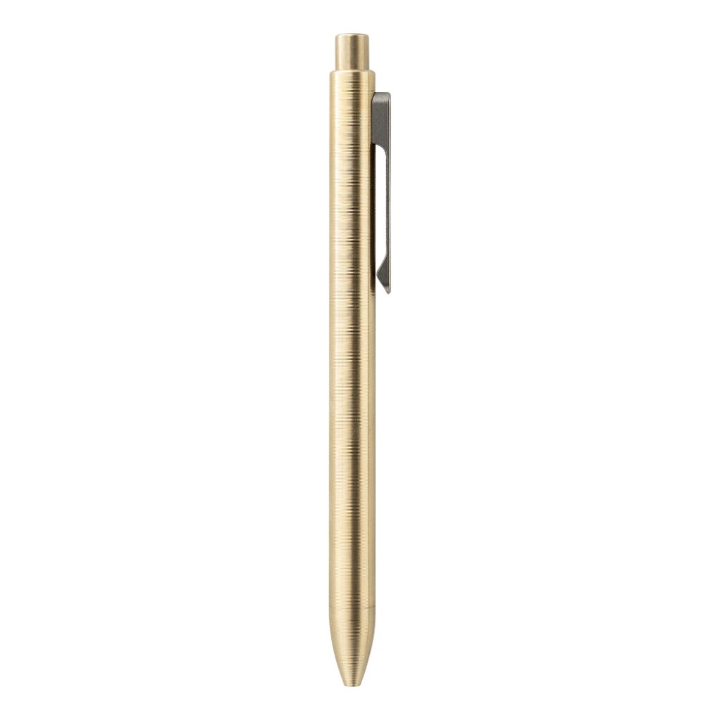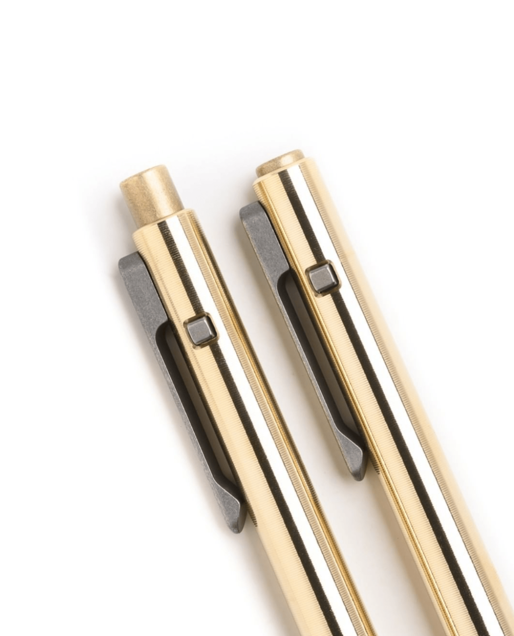 Pen #3 Bronze machined, and polished body with raw bronze buttons and a titanium clip with engraved KORE Logo. *May patina with use.*