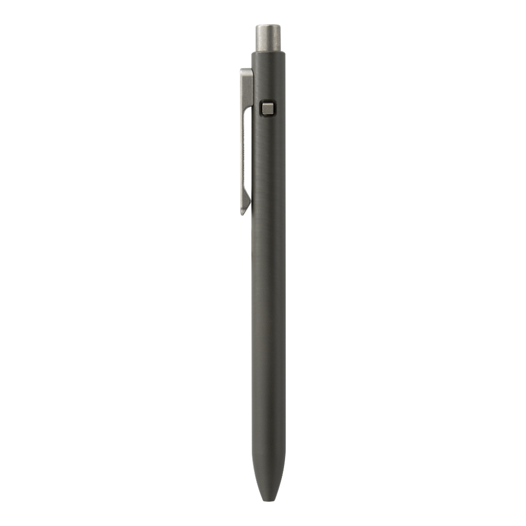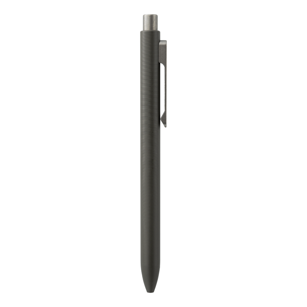 Pen #1 Titanium, Black DLC (Diamond Like Coating) Finish on the body along with raw titanium buttons and clip with engraved KORE Logo.