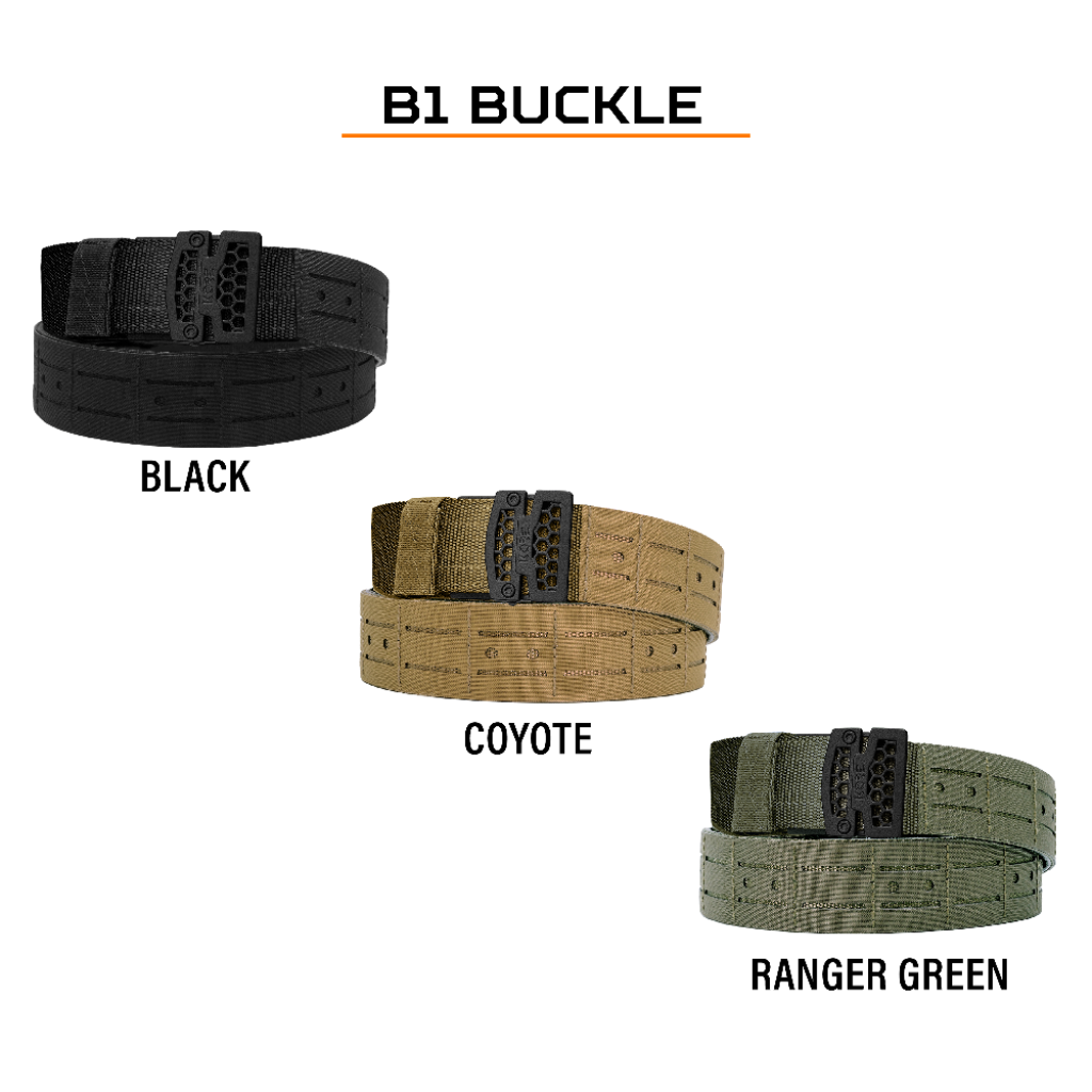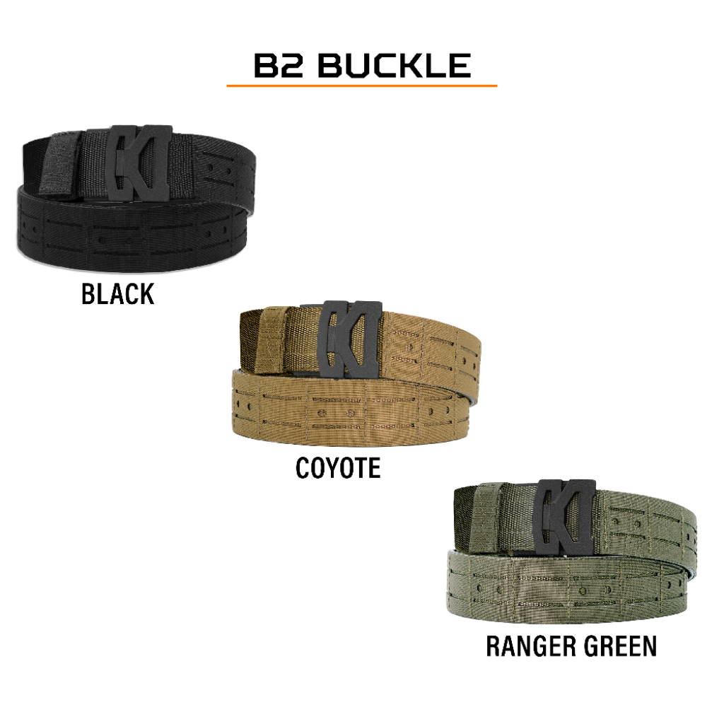 Choose any of our X-series gun buckles (1.5" wide) or beefier Garrison (1.75" wide) styles. The only difference between buckle models is the style & width - the functionality is identical.