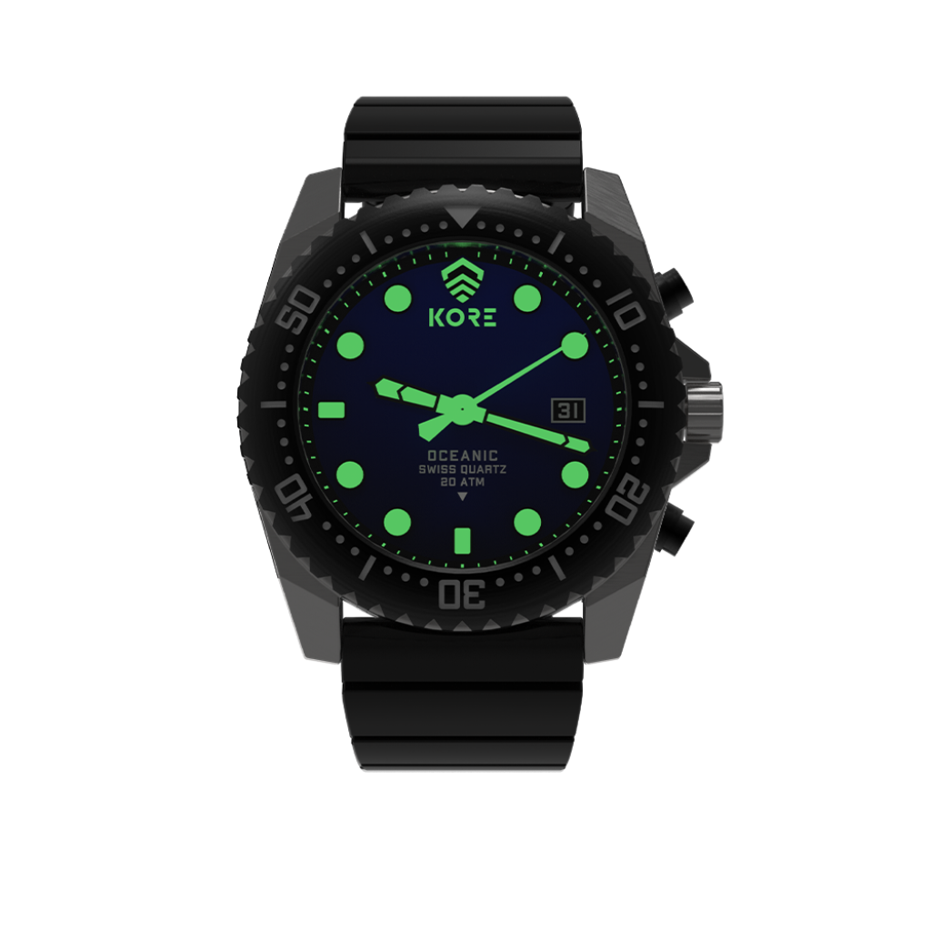 Includes: KORE Oceanic Dive Watch, 2 Interchangeable micro-adjustable bands (Dive & Overland Models) and Ammo Case Watch Box