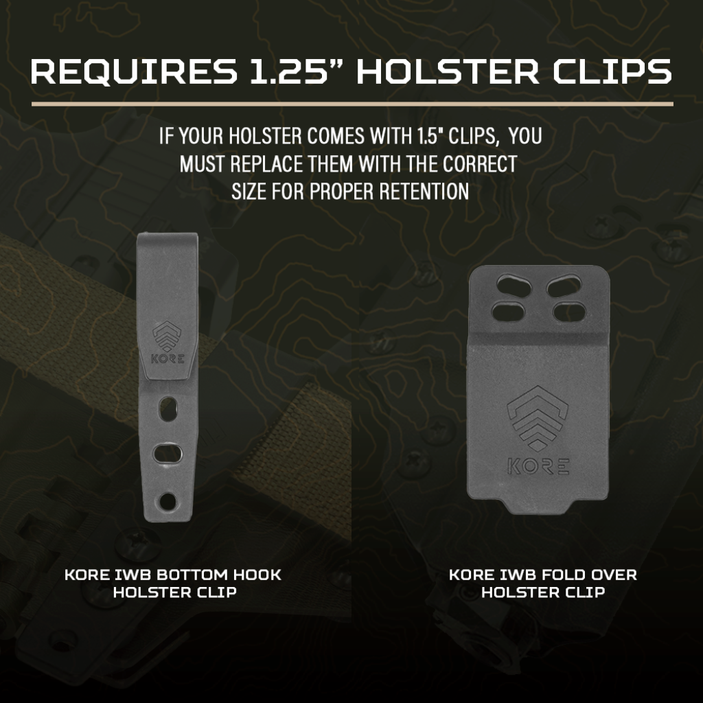 Important Compatibility Note: This belt requires 1.25" holster clips for a secure fit. If your holster comes with 1.5" clips, you must replace them with the correct size for proper retention. Please check your holster specifications before purchasing.