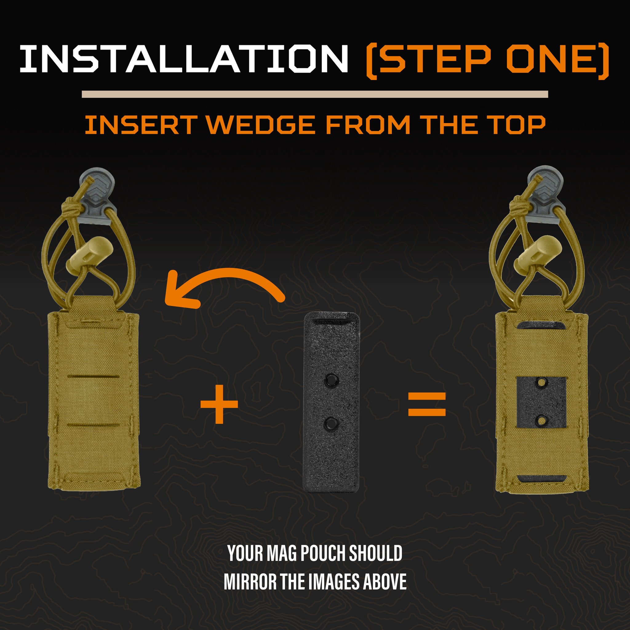 Slide the flat wedges through the MOLLE on your mag pouch. Then attach the mounting plate to the back of the wedges. Slide the full assembly through the MOLLE webbing on your belt and secure it with the bottom screws.