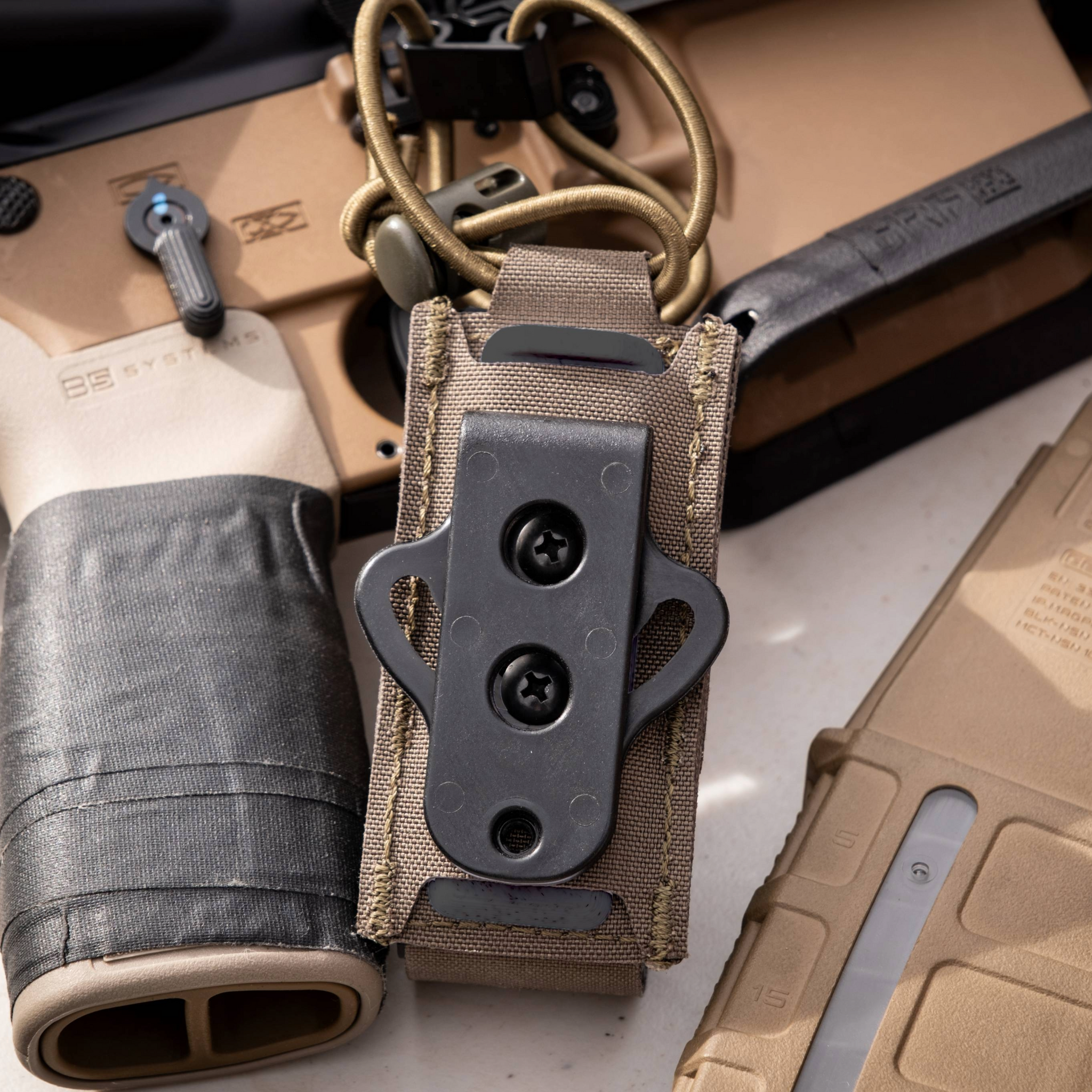 The Swinger Mount secures directly into your mag pouch and slides right into your MOLLE belt, locking in place with the included hardware. No extra mounting plates needed- just screw it in and go.